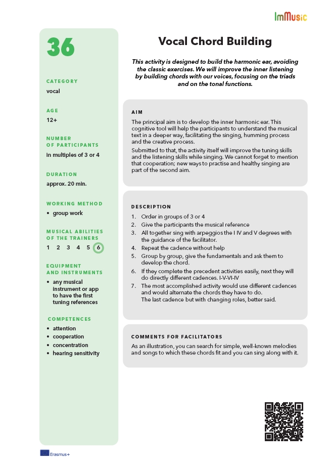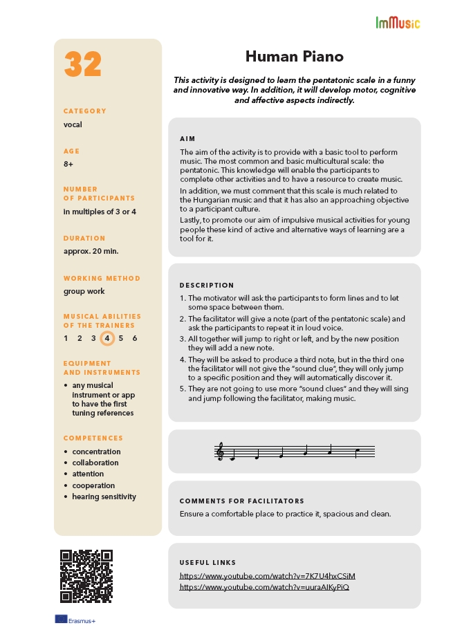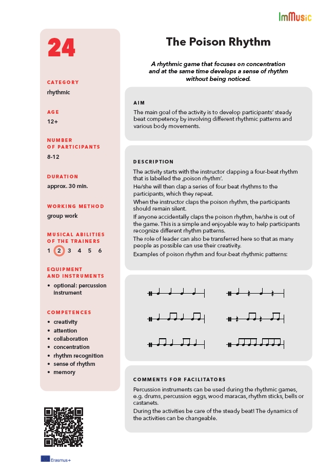 The games in the ImMusic toolkit are carefully designed to be clear, flexible, and ready to use – whether you’re a youth worker, educator, or workshop facilitator. Each activity includes detailed instructions, clearly defined competences, recommended group size, age range, duration, and the equipment you may need (often minimal, sometimes just a metronome or your voice).